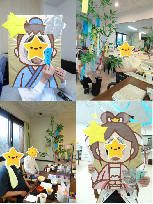 リンクハート下坂部では七夕の日に職員手作りの織姫と彦星のパネルを用意しました~(*'▽')
